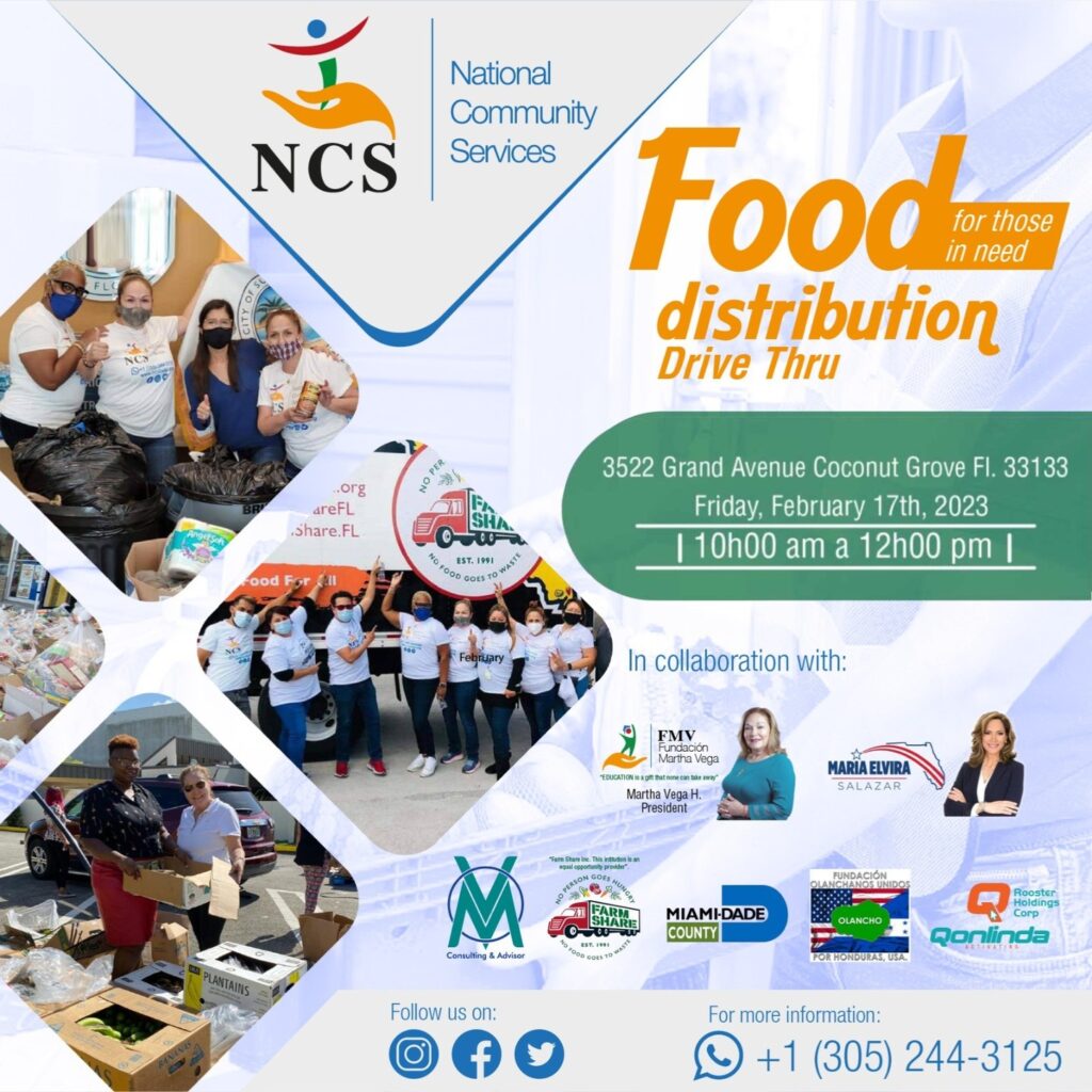 El pasado 17 de febrero de 2023, National Community Services y la Fundación Martha Vega se unieron para realizar una entrega de alimentos para los más necesitados en Coconut Grove. La iniciativa, que se lleva a cabo una vez al mes, tiene como objetivo brindar ayuda alimentaria a las personas en situación de vulnerabilidad en la comunidad.