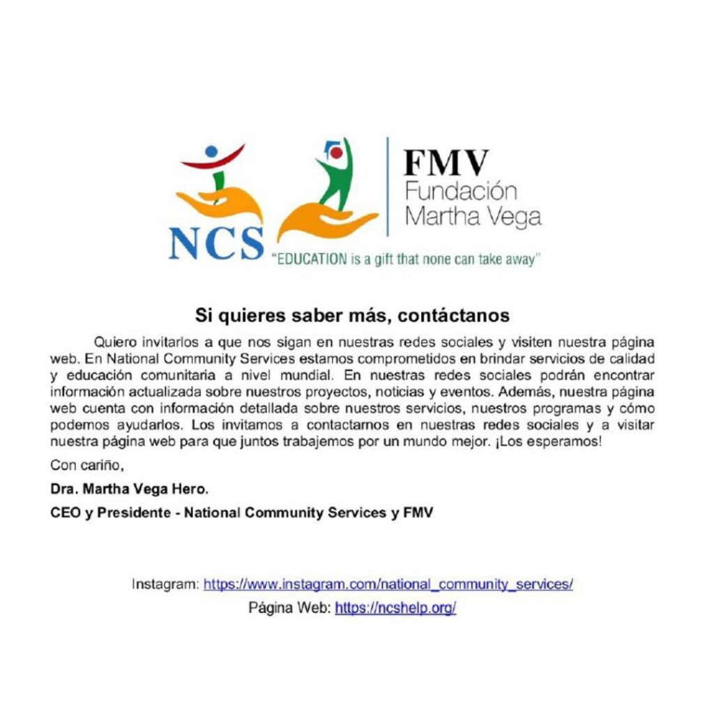 Quiero invitarlos a que nos sigan en nuestras redes sociales y visiten nuestra página web. En National Community Services estamos comprometidos en brindar servicios de calidad y educación comunitaria a nivel mundial. En nuestras redes sociales podrán encontrar información actualizada sobre nuestros proyectos, noticias y eventos. Además, nuestra página web cuenta con información detallada sobre nuestros servicios, nuestros programas y cómo podemos ayudarlos. Los invitamos a contactarnos en nuestras redes sociales y a visitar nuestra página web para que juntos trabajemos por un mundo mejor. ¡Los esperamos!