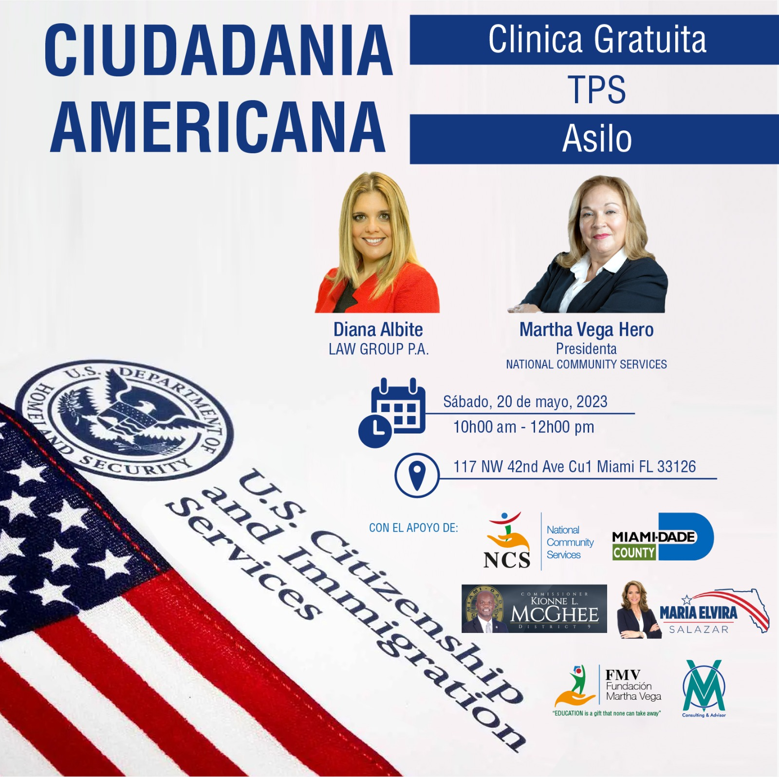 Esta clínica es posible gracias al apoyo de NCS, Miami Dade County, Kionne McGhee, Congresista Maria Elvira salazar, Fundación Martha Vega y MV Consulting & Advisor, quienes se han unido para brindar este servicio gratuito a la comunidad.